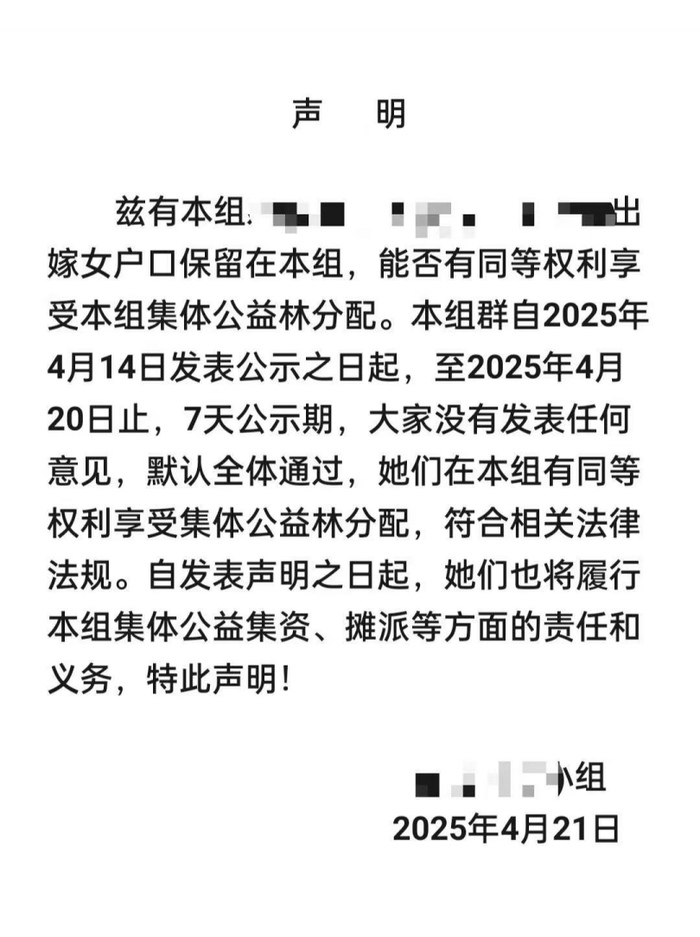 2025年4月21日,安徽的一个村子通过了新的公示——户口留在本村的出嫁女,拥有享受本组集体公益林分配的同等权利。