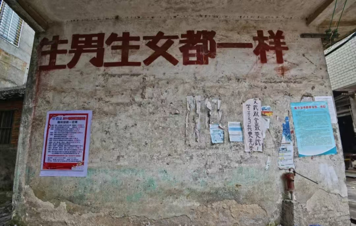 回去的路上,任雪萍看到了村里老房子墙面上的红色大字“生儿生女都一样,女儿也是传后人”“生女儿光荣 ”。