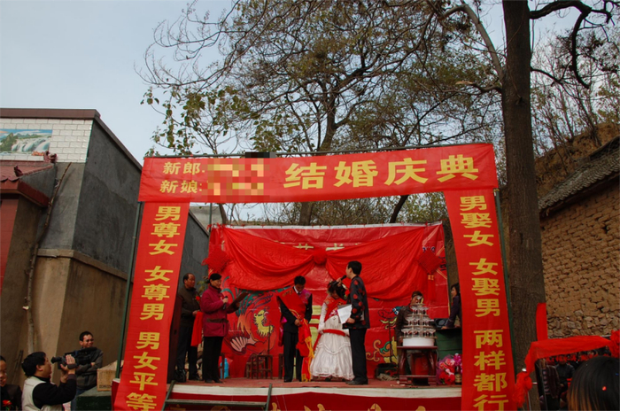 婚礼在女方家举办,礼台两边挂着的巨大的条幅上写着,“男尊女,女尊男,男女平等;男娶女,女娶男,两样都行”。