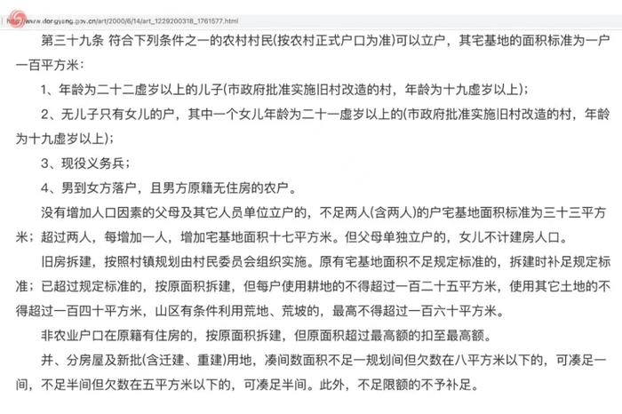 继续申诉时,她得知了《东阳土地管理实施细则》第三十九条规定。这条规定导向了最坏的结果,因为父母有儿子,所以她作为女儿不可能申请到宅基地。