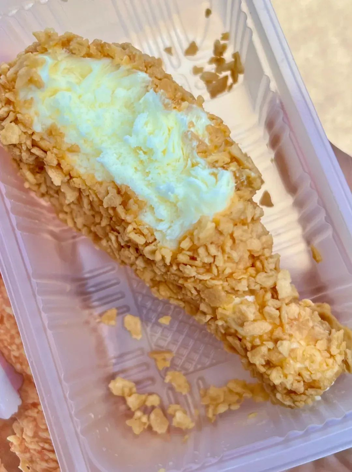 “玉米棒”外层是脆脆的玉米造型威化壳,内芯塞满奶香雪糕,吃法讲究“先剥皮后啃芯”——咬开金黄的华夫皮外壳,会有种仿佛在丰收玉米的奇妙体感。最绝的是吃完后,竹签上还粘着几粒“漏网之玉米”,得用门牙一点点刮干净才算圆满。