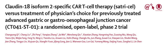 2025年6月1日,由沈琳教授团队设计主导的全球首个CLDN18.2 CAR-T胃癌随机对照研究,“Claudin-18 isoform 2-specific CAR T-cell therapy (satri-cel) versus treatment of physician’s choice for previously treated advanced gastric or gastro-oesophageal junction cancer (CT041-ST-01): a randomised, open-label, phase 2 trial”的阳性结果正式发布于国际权威学术期刊《柳叶刀》(Lancet),并由第一作者齐长松教授同步在2025年美国临床肿瘤学会(ASCO)进行大会口头报告,引起广泛关注。