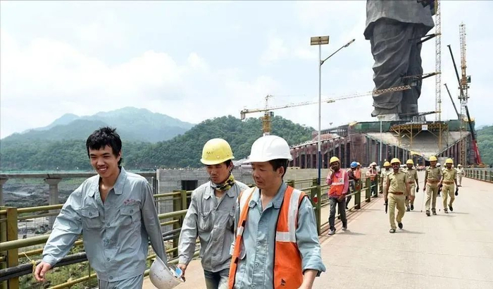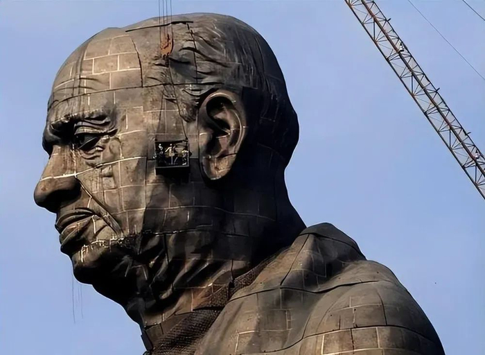 最后到了印度,雕像主体吊装工程的80%,也是由中国三一重工印度分公司完成,他们用中国设备,将单块4.5米的青铜板,精准吊装到对应高度,误差控制在3毫米内。