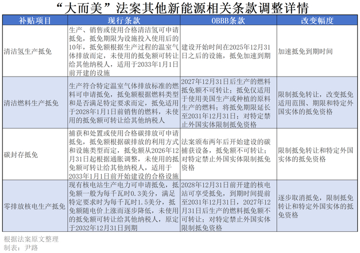 OBBB法案对IRA及其他相关法案中新能源补贴条款的调整主要针对新能源车、风电和光伏,在核能、绿氢,生物质燃料等领域调整不大。