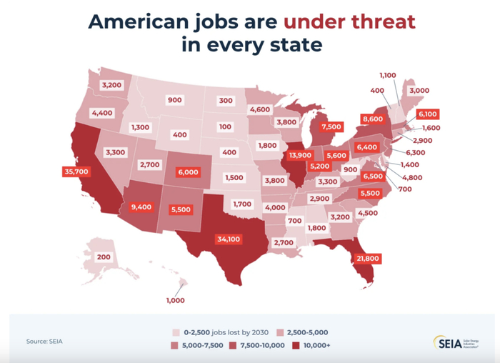 美国太阳能产业协会(SEIA)警告称,如果法案未经修改就通过,美国将有33万个现有及未来的工作岗位面临风险,有331家工厂可能因此关闭或取消建厂规划。其中加利福尼亚州、得克萨斯州、佛罗里达州和伊利诺伊州等将受最严重的打击,而大多数失业岗位将出现在特朗普2024年获胜的州。