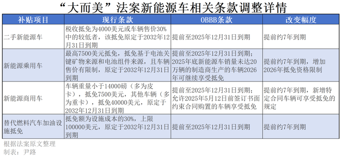 新能源车是OBBB法案调整幅度最大的部分,除极少数豁免对象,全部新能源车有关的补贴均在2025年12月31日提前到期,和IRA相比,提前7年,基本等同于法案已经通过就立即执行,是补贴削减最快、幅度最大的项目。