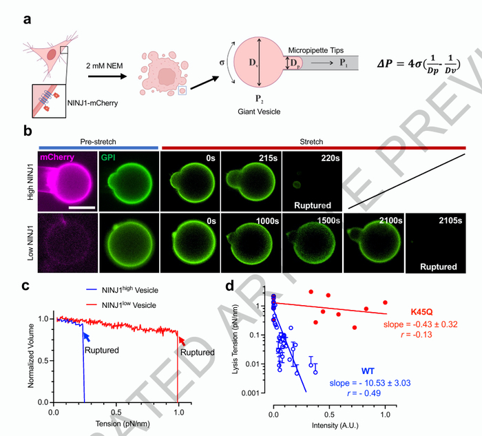 作者利用巨大细胞膜囊泡(GPMV)进行实验,通过微吸管吸引技术测量了GPMV在不同NINJ1表达水平下的破裂张力。结果显示,NINJ1高表达的GPMV在较低的张力下就会破裂,而NINJ1低表达的GPMV则需要更高的张力才会破裂。这表明NINJ1能够直接改变细胞膜的生物力学性质,使其更易破裂。此外,作者还展示了NINJ1的K45Q突变体(活性降低)对细胞膜破裂的影响较小,进一步证实了NINJ1在细胞膜破裂中的关键作用。