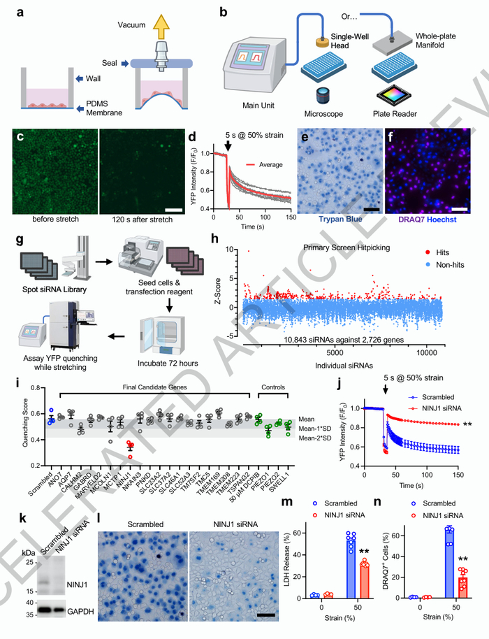 图中描绘了系统的结构和操作模式,包括单孔显微镜成像和全板读取器成像两种方式。通过在HeLa细胞中表达一种对氯离子敏感的YFP变体,并对其施加不同强度的机械应激,作者观察到YFP荧光淬灭现象,表明细胞膜的通透性增加。进一步的实验通过Trypan Blue和DRAQ7染色证实了细胞膜的破裂。基于此,作者进行了大规模的siRNA筛选,针对2726个多跨膜蛋白基因进行筛选,最终鉴定出NINJ1作为机械应激诱导细胞膜破裂的关键调节因子。
