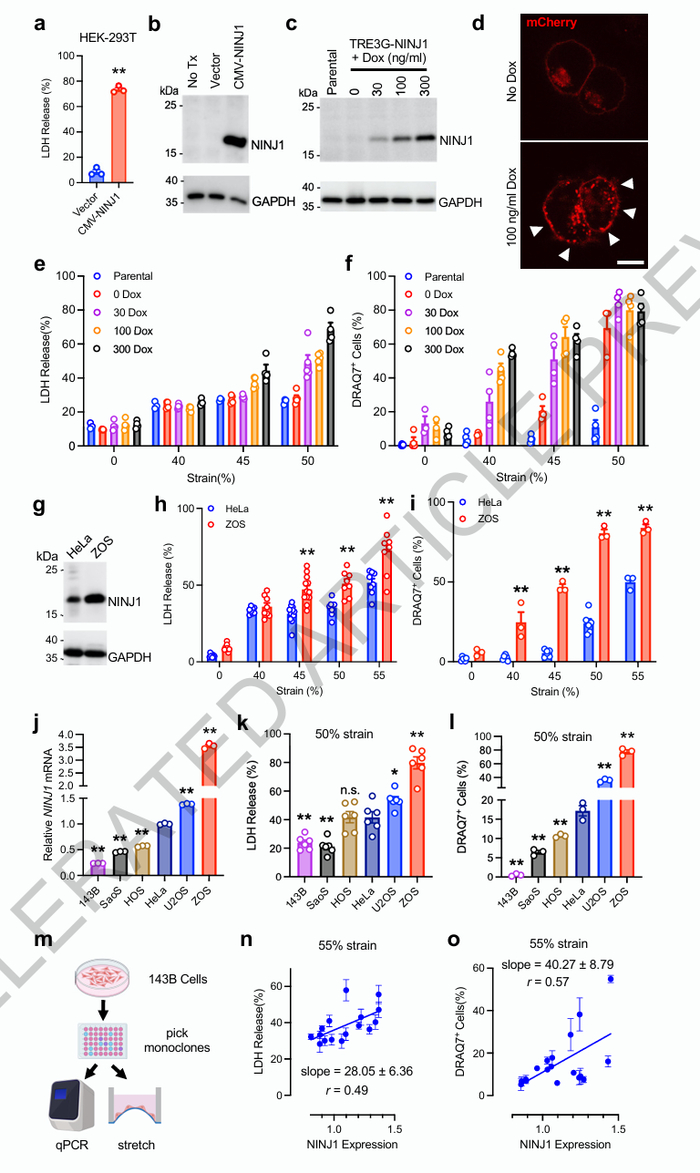 作者通过在HEK-293T细胞中过表达NINJ1,发现这会显著增加细胞的细胞毒性,表现为LDH释放增加。进一步构建了一个Doxycycline诱导的NINJ1过表达细胞系,发现随着NINJ1表达水平的升高,细胞对机械应激的敏感性增强,即在较低的应变水平下就容易发生细胞膜破裂。此外,作者还比较了不同细胞系(如HeLa和ZOS细胞)中NINJ1的表达水平与细胞膜破裂率之间的关系,发现NINJ1表达水平较高的细胞系在机械应激下更容易发生细胞膜破裂。