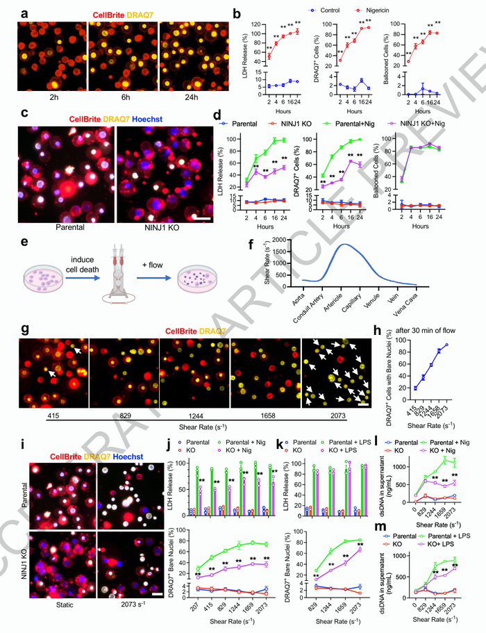 作者使用THP-1细胞进行实验,通过Nigericin诱导焦亡和LPS诱导铁死亡,观察了NINJ1在这些过程中的作用。实验结果显示,在焦亡过程中,NINJ1的激活导致细胞膜上出现大孔隙,允许细胞内容物的释放,但细胞膜并未完全破裂。然而,当施加额外的机械应激(如流体力学应激)时,NINJ1的存在显著增加了细胞膜完全破裂的概率,从而促进了DAMP的释放。此外,在铁死亡过程中,NINJ1同样对细胞膜破裂和DAMP释放起到了关键作用。这张图通过细胞死亡模型和相关实验数据,揭示了NINJ1在细胞死亡相关细胞膜破裂和炎症反应中的重要性。
