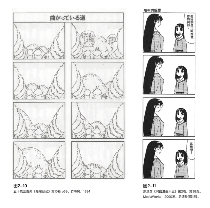 或许有必要特别指出,四格漫画具有得天独厚的"支线叙事"优势。若是所谓的长篇漫画,必须借助某种显性符号——无论是表情符号还是分格技巧中的隐喻设置——来标示多个场景(及事件)的并行叙述。而四格漫画却能通过格位的交替陈列,天然具备彰显这种并行性的独特表现力。(『児童漫画の領域』漫画史研究第1号、1994年)