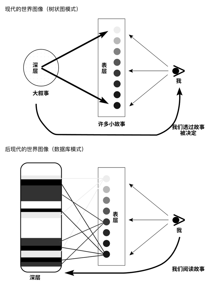 在此范式中,"现代性"被定义为——人们深信在可见的"表层"现象背后,存在着统一掌控的核心支点;而"后现代性"则认为,"表层"呈现的不过是数据库调取的数据组合,根本不存在统摄表层的超越性支点,这种状态恰似"深层"的消亡。但东浩纪指出,这并非真正的深层消失,而是以另一种形态显现——其对应物正是"数据库"中的"数据"。