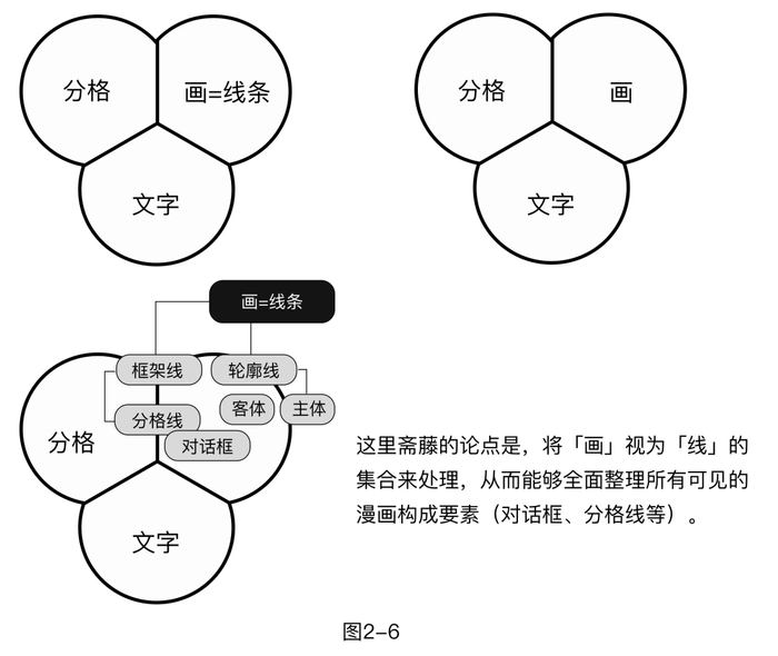 斋藤将这张图称为"作为理论框架的模型",是"分析'现代漫画'结构的第一步"。同时,他将"图画"定义为具有多义性的线条集合;而"分格"在形态上被定义为"以四边形为基础的边框线(分格线)及其内部空间",在功能上则是"通过直线围合确保内部空间的存在,通过分格之间的连续排列构建时间序列",并指出这是"掌控漫画时间进程的基本单位"。关于"分格"的定义,本书也采用这一观点。