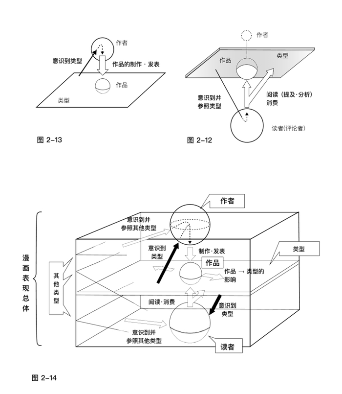 若从作者视角新绘制同样的示意图,则呈现图2-13的形态。对照观察两图会发现,当把"类型"视为二维平面时,读者与作者恰似形成了近似镜面对称的拓扑关系(图2-14)。这种结构具有逻辑必然性——因为作者本身也需要通过阅读其他作品,从而意识到类型的存在。