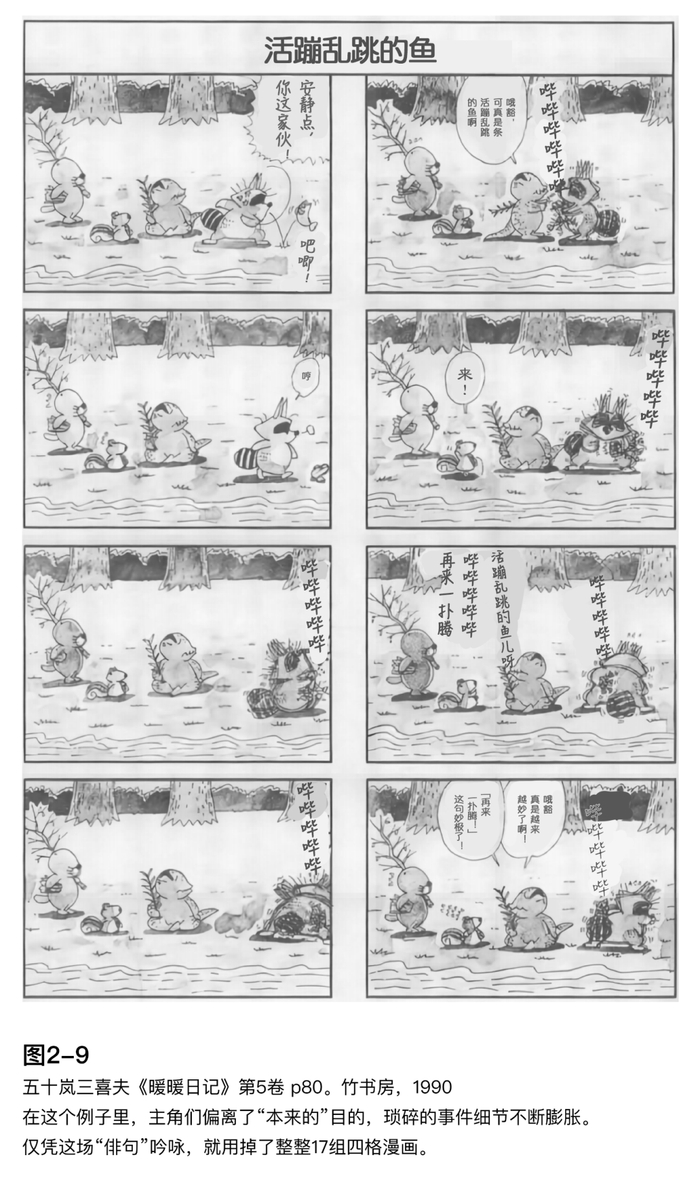 例如在《暖暖日记》中,正是由于严格规定了四格或八格的版面分割形式,反而能够对故事细节进行极致精微的刻画——无论是被无限拉长的时间感,还是静静流淌的日常时光。正如关在第五卷中所解释的那样(参见图2-9中暖暖等三个小家伙与"大鲵先生"的问答场景),原本暖暖他们是来打听"渔猫先生"的下落,却在不知不觉间演变成了互相吟诵俳句的温馨场面。