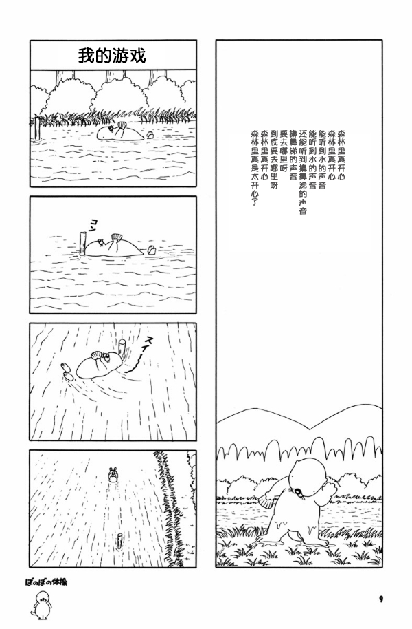 这些要素构成了漫画的基础,同时也让形象被确认为"形象"的关键所在。特别是在《我的游戏》这个例子中,"运动描述"这一项完全抽离了"故事性要素",仅仅呈现物体移动这种纯粹的物理性"运动"记录,这一点尤为关键。这种运动方式几乎彻底否定了作为登场人物暖暖的主体意志(毕竟,他只是随波逐流的状态)。而作为读者的我们,只能勉强通过《我的游戏》这个标题来揣测暖暖意志的存在——而这种认知,唯有在理解"我"这个人称代词指代的是海獭形象时,才得以成立。
