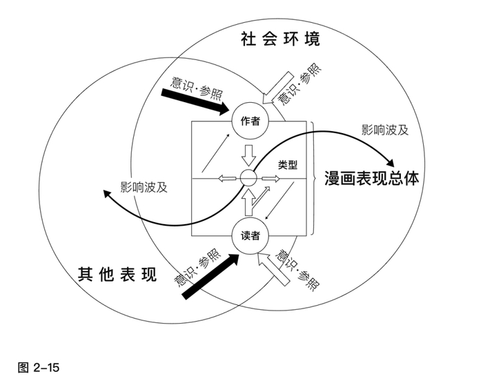 此外,我们可以进一步拓展这个理论框架(如图2-15所示),因为"类型"这一"环境"本身也可视为嵌套在更高维"环境"中的子系统。在更上位的"环境"层级中,既可能包含"漫画"这一整体概念,也可能延伸至更为广义的"表现"全域,甚至最终指向整个"社会"系统。