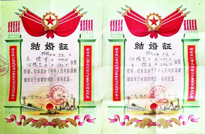 “1970年,我们在湘潭楠竹山革命委员会领取了这张结婚证,当时我们分别穿着军装和工服,表达了对党和政府的感谢,也坚定了未来携手服务家庭、服务社会的决心。”