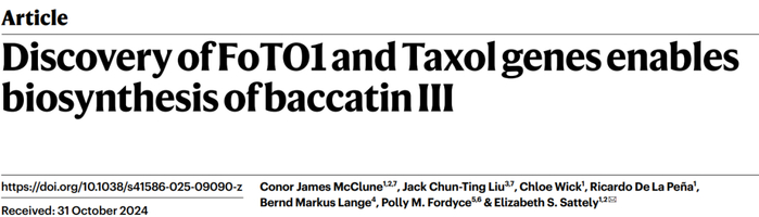 [1] McClune, C.J., Liu, J.CT., Wick, C. et al. Discovery of FoTO1 and Taxol genes enables biosynthesis of baccatin III. Nature (2025). https://doi.org/10.1038/s41586-025-09090-z