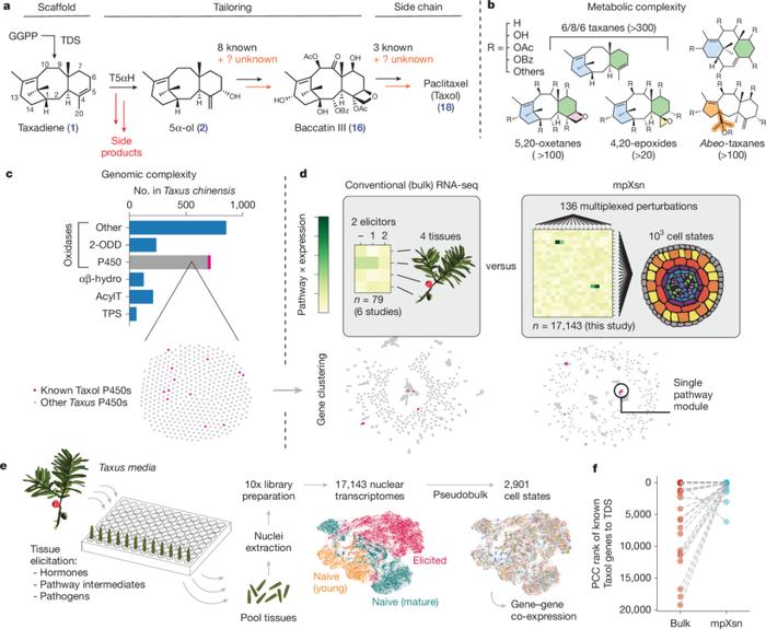 过往研究认为,紫杉醇的生物合成途径涉及到19步化学反应。自20世纪90年代末以来,科学家们已经鉴定出了参与反应的12种酶,但剩余的一些关键酶仍难以确定。为了解开其中的谜团,研究者对数千个来自紫衫针叶的单个细胞进行了mRNA分析。实验中,他们还对一些细胞施加了不同的条件,例如添加盐或细菌化合物,用来确定提升巴卡亭III产量的机制和受影响的基因。