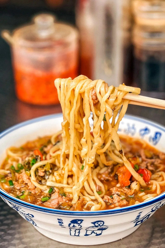 先炒浇头。这的浇头很丰富,牛肉、鸡肠、雪菜、腰花、笋片、鲜虾……而且讲究“一碗一烧”,食客可以根据自己的喜好搭配浇头,师傅自然会选择合适的烹饪方式,可浓油赤酱,可清淡白烧。无论如何,浇头都是现场爆炒,锅气十足。炒到一定火候,下高汤,加面条,让筋道的面条充分吸收了浇头与面汤的鲜美,才一气端上桌。