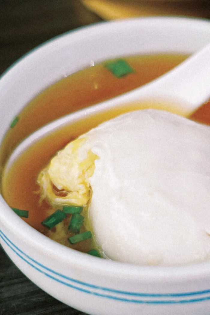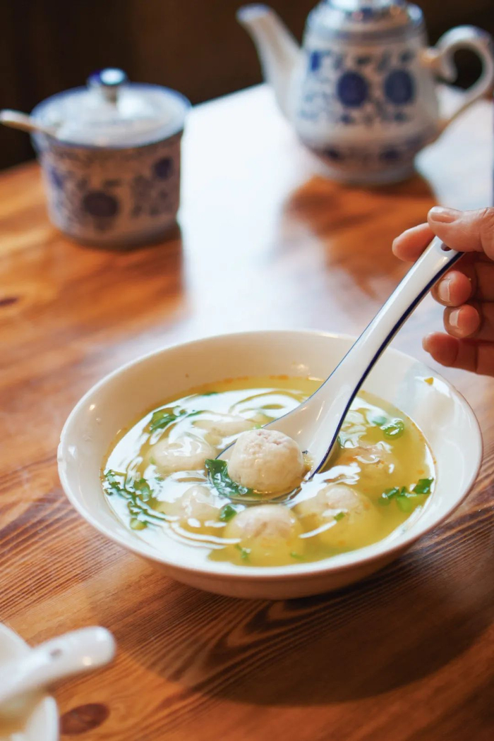 相比之下,豆腐汤圆就要温柔许多。说是“汤圆”,其中并不包含糯米,完全是用老豆腐包裹肉馅儿,在生粉中滚上一圈,滚得一个个光滑细腻,然后放入高汤之中煮熟。那份细嫩鲜美简直不是语言能够描述的。