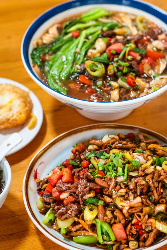 兰溪牛肉鸡肠炒面和牛肉汤面。 摄影/赵梓淇