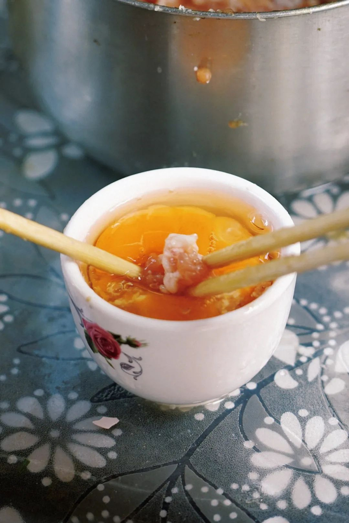 听名字,这道美食可是够扎实了,其实制作手法非常精细——打一个生鸡蛋,在蛋黄上戳个小洞,把二肥八瘦的夹心猪肉馅一点一点地塞进蛋黄里。一个小小的蛋黄通常能“喂”进去一两肉馅儿,而蛋膜依然完整不破,没有高明的手艺是万万办不到的。