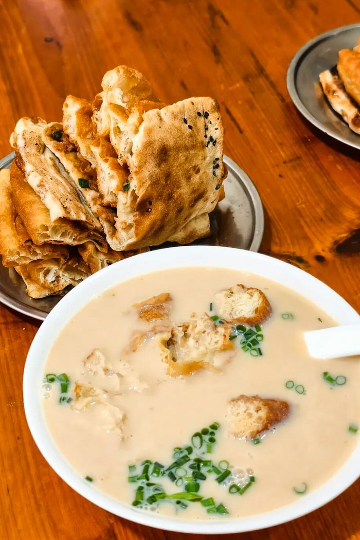 与带饼油条最搭的,当然是一碗咸豆浆。兰溪的咸豆浆不是用盐调味,而是用酱油,点上一点葱花,香得层次丰富,一环套一环。别管你是“甜党”还是“咸党”,保证一口就被征服。