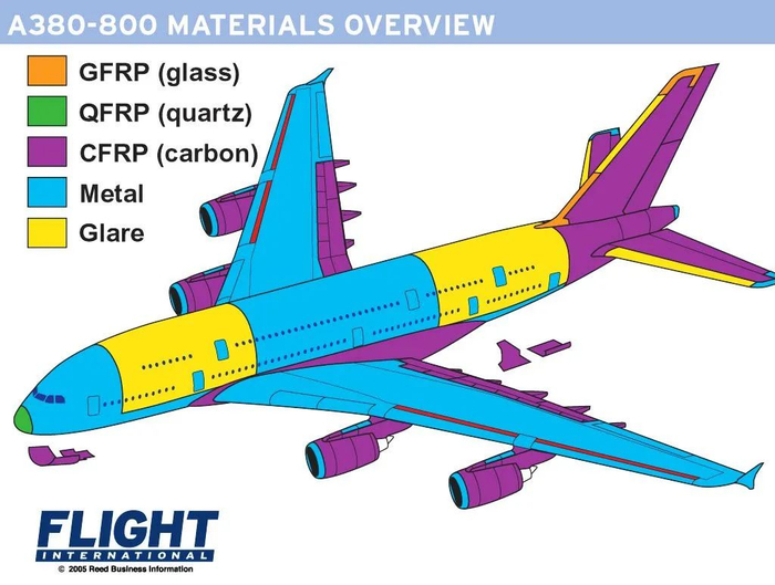 ▲ A380上的各种复合材料在A380飞机上,就采用了大量的复材进行制造。