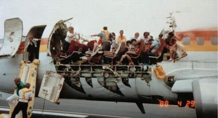 ▲ 阿罗哈空难这张照片是后续的,我们称为阿罗哈空难。当时飞机在飞行过程中,前半机身的上壁板几乎全部脱落。