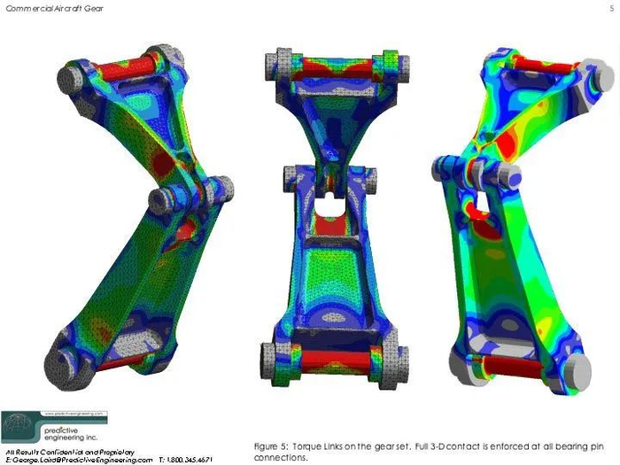 ▲ 部件受力情况的可视化还有结构受力的情况,我们也可以以一种可视化的方式展现给大家。这是飞机起落架上常见的东西,叫抗扭臂,越鲜艳的部分就是受力越大的部分,我们可以通过计算结果对结构进行优化。
