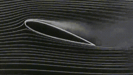 我们会发现,翼型的迎角在逐渐增大,向上偏转,上翼面的气流逐渐开始紊乱。最开始还是层流状态,流动地非常均匀,迎角大到一定程度,上翼面气流就完全分离了。升力其实就是利用机翼划过空气的时候,上下翼面之间的压差产生的。
