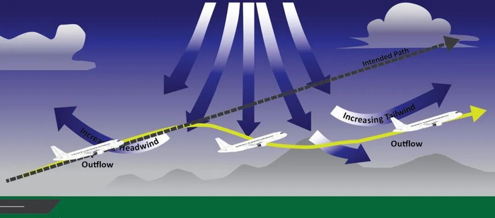 ▲ 风力对飞行的影响大家看一下,这架飞机在刚起飞的时候,遇到逆风,到中间的时候遇到下降气流,再往前一点又变顺风了,所以气象条件对飞机的飞行也有一些影响。除了风以外,还有就是雷暴。