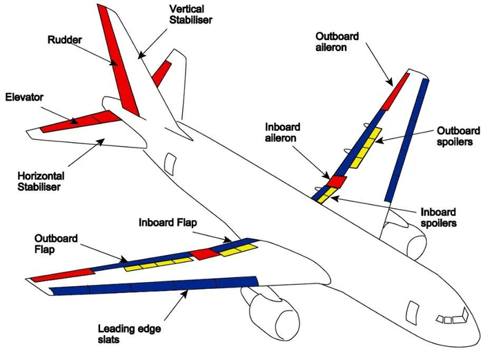 怎么样来避免人为的差错?我从飞机的飞行控制系统来举个例子,现在飞机的操纵系统有两大类:一类是机械的,我们用液压来进行助力;还有一类是电传的,在图上,大家能看到飞机的很多操纵面,它能控制飞机的抬头、低头、俯仰、横滚,还有偏航。