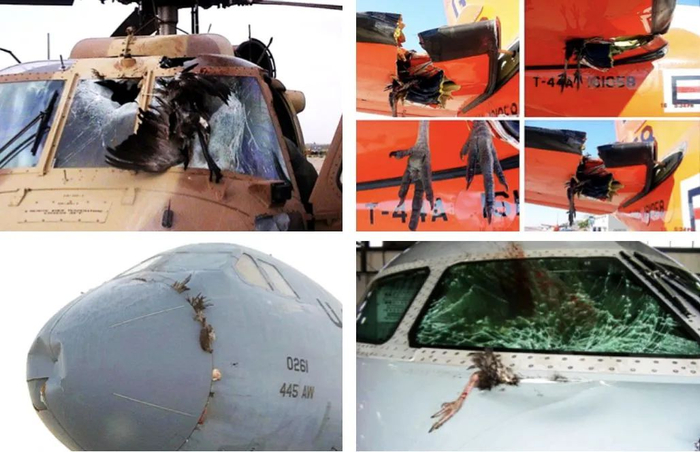 ▲ 鸟与飞机相撞引发的事故大家可以看这张图,鸟撞到飞机上。一只很小的鸟,很柔弱的样子,它为什么会把飞机撞成这个样子,因为相对速度大。民航飞机和军用飞机都会考虑到这些问题,在设计的时候,就已经考虑到这些因素,在结构上做了一些布置。