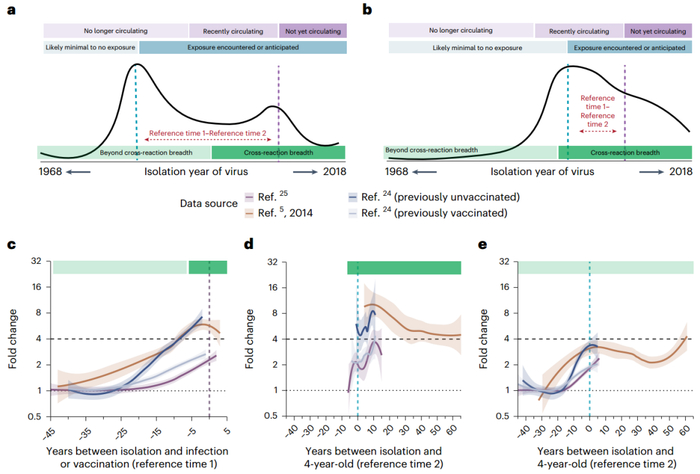 该研究分析了现有的抗体-病毒数据,发现单次接触雪貂或人类抗血清具有共同的交叉反应特征。尽管每种流感亚型表现出不同的特征,但亚型内的反应主要取决于测试病毒和免疫病毒之间的隔离时间差异。A(H3N2)抗体的交叉反应性有限,衰减超过6 年,比甲型H1N1流感pdm09的周期短。病毒进化仅部分解释了这种广度,表明隔离时间的差异提供了关键的独立信息。研究人员观察到,在雪貂或仅暴露于单一抗原簇的儿童中,A(H3N2)的宽度是一致的。纵向抗血清结果表明,通过感染或接种疫苗反复暴露于A(H3N2),在感染或接种病毒的交叉反应范围内,HAI对病毒的反应显著增加,在感染后或接种疫苗后,这些病毒的变化很小。这些结果为流感病毒等抗原性进化的病原体提供了框架。