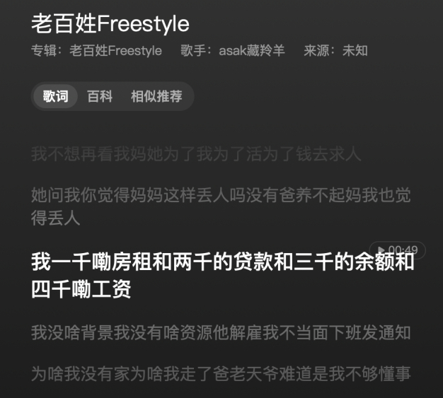 《老百姓freestyle》歌词和早期说唱“耍帅”“炫富”“diss”等叙事侧重点不同,这一批爆火的rapper是因为描述底层生活的“平民叙事”而被大家喜爱,可以说,中文说唱在词作上进入了 2.0 时代。