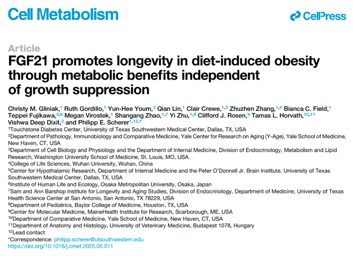 2025 年 6 月 16 日,德克萨斯大学西南医学中心的研究人员在 Cell 子刊 Cell Metabolism 上发表了题为:FGF21 promotes longevity in diet-induced obesity through metabolic benefits independent of growth suppression 的研究论文。