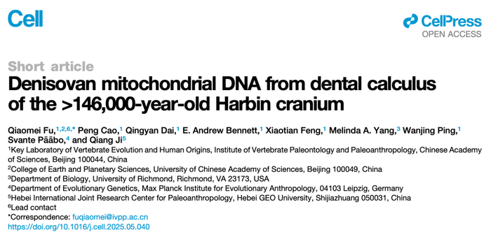 2025 年 6 月 18 日,中国科学院古脊椎动物与古人类研究所付巧妹团队与河北地质大学季强团队及古 DNA 技术先驱、2022 年诺贝尔生理学或医学奖得主Svante Pääbo 教授合作,在国际顶尖学术期刊 Cell 发表了题为:Denisovan mitochondrial DNA from dental calculus of the >146,000-year-old Harbin cranium的研究论文,该研究通过古 DNA 技术为“龙人”的群体归属以及丹尼索瓦人的较完整形态提供了关键线索。