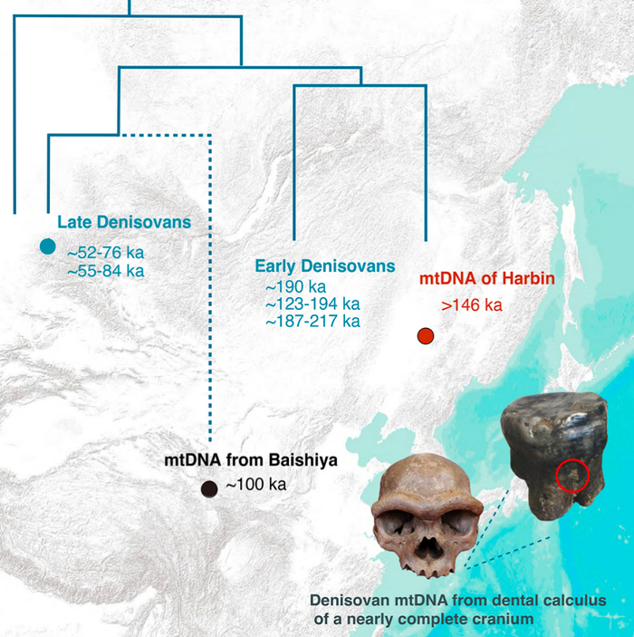 通过获取的宿主线粒体 DNA 分析显示,哈尔滨古人类个体属于丹尼索瓦人分支,研发生信分析方法确定不同支系的关键位点,明确了其与西伯利亚丹尼索瓦洞穴早期个体更相关,而与晚期个体不同。结合这些个体的年代信息,丹尼索瓦洞穴早期个体的年代范围分别是 18.7 万-21.7 万年,12.3 万-19.4 万年和约 19 万年前,晚期个体年代大约为 5.2 万-8.4 万年,而哈尔滨古人类个体的年代不晚于 14.6 万年,与早期丹尼索瓦人的年代更接近。