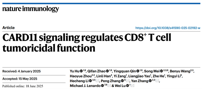 2025年6月18日,中国科学院上海营养与健康研究所吕伟研究组联合国内外合作者在Nature Immunology期刊在线发表题为“CARD11 signaling regulates CD8+ T cell tumoricidal function”的研究论文。该研究利用病人来源的T细胞受体(T cell receptor)信号通路下游关键蛋白CARD11突变体,通过构建Card11基因突变型小鼠,在小鼠肿瘤模型中揭示了TCR信号通路强度与肿瘤中T细胞耗竭性分化的关系。发现通过调节CARD11介导的不同TCR信号强度能够增加肿瘤微环境中TCR克隆的多样性,提升T细胞的抗肿瘤免疫应答,为改进癌症免疫疗法提供了一种新策略。