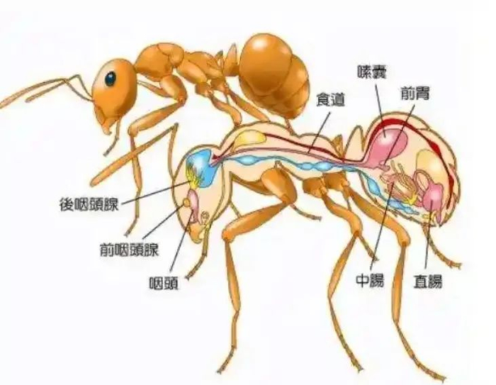 注意到上面蚂蚁的生理结构了吗,它们的前胃和嗉囊是在身体最后一节中,而连接最后一节的过道是非常细小的。