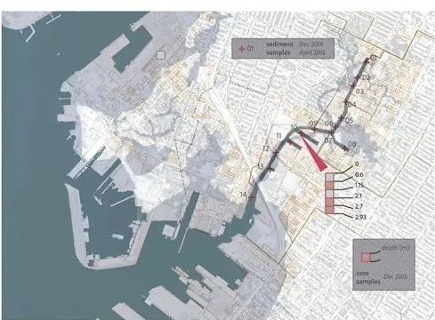 研究人员在戈瓦纳斯运河的14个地点采集了样品 图片来源于论文这一切都因为在运河诡异、沉默的墨绿色河水之下,其河床中已积累了近一个半世纪的污染物。早在19世纪,就有报道称,运河底部有一层厚厚的“黑色蛋黄酱”淤泥。美国纽约大学的计算生物学家伊丽莎白·赫纳夫(Elizabeth Hénaff)表示,这些污染性的沉积物已经堆积了3米~6米厚。它们由运河中原始的沉积物、逾150年的工业废料、周边地表径流流入,以及混合污水溢流(CSO)和涌入河道的潮汐共同塑造。