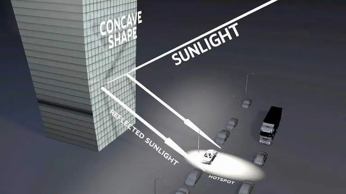 这样的设计,就好比一个太阳能灶,在一定的时间,恰巧太阳光射到大楼外墙上,通过玻璃反射,光线被聚焦在一个区域上,并产生大量热量。