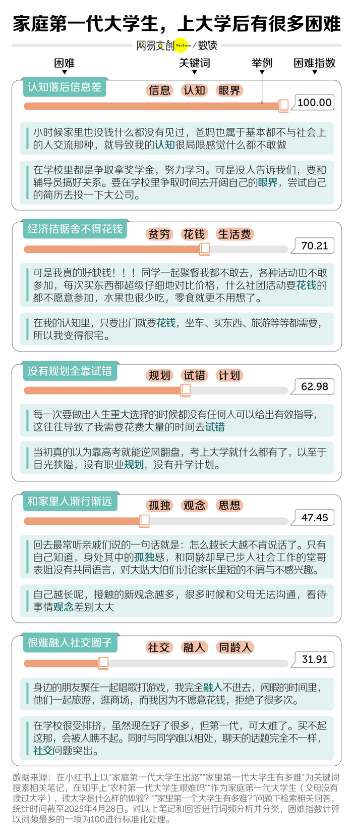 不过比起学业,更愁人的还是日常生活。许多第一代大学生,花起钱来纠结又拧巴,舍友每周四狂炫热辣香骨鸡,自己只能选择价格更友好的食堂;好朋友邀请团建聚餐,自己满心欢喜,但手头却总是缺钱,推脱成了常态。