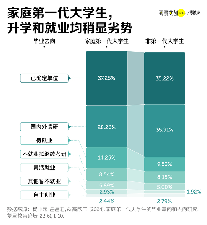 上述《复旦教育论坛》刊发的研究还显示,只想读完本科,不再继续学历攀登的第一代大学生,要比非第一代大学生多出 7% [6],反映在毕业去向上,选择国内外读研的第一代大学生,也要比非第一代大学生要少。