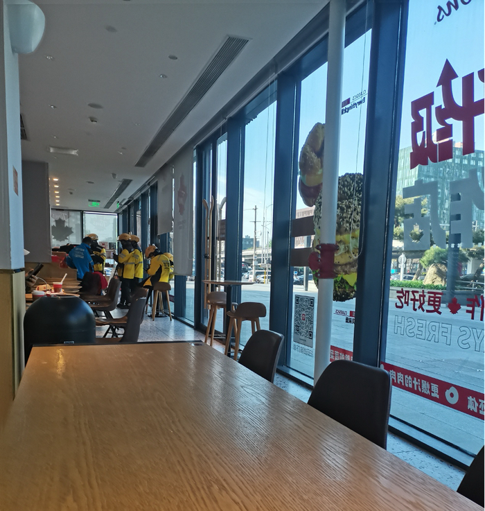 门店外站着两名抽烟的骑手。在他们的身后,一整面落地窗张贴着宣传海报。在Tims招牌的贝果堡和可颂参考图旁,红色字体的“升级”和“新鲜手做更好吃”尤为显眼。