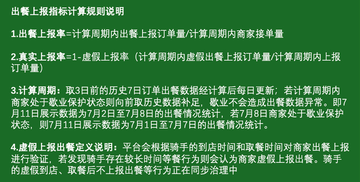 某平台的出餐上报指标计算规则,刺猬公社整理问题在于,出餐真实上报率并不等同于出餐超时率。商家可以“牺牲”出餐超时率,即便出餐超时率较高,能确保出餐真实上报率的达标,结果也是一样的——商家不用承担配送超时的责任。