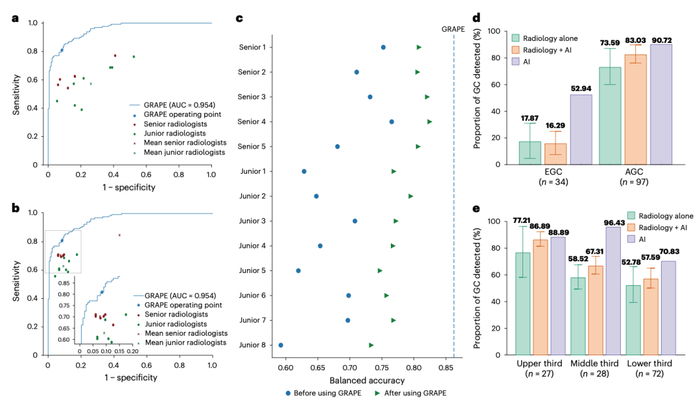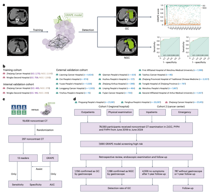 该研究开发了基于 AI 的大规模胃癌筛查模型——“GRAPE”,其利用平扫 CT 图像和 AI 实现大规模、高效的胃癌筛查。该研究显示,GRAPE 显著优于专业放射科医生,敏感性提高了 21.8%,特异性提高了 14.0%,尤其是在早期胃癌方面。